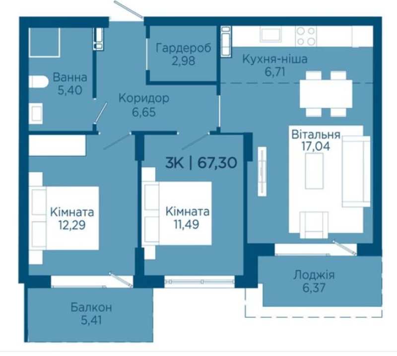 Загальна площа 67.30 м2, житлова площа 40.80 м²